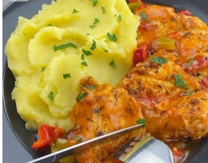 Pollo guisado con puré de papas y ensalada verde (Antares)